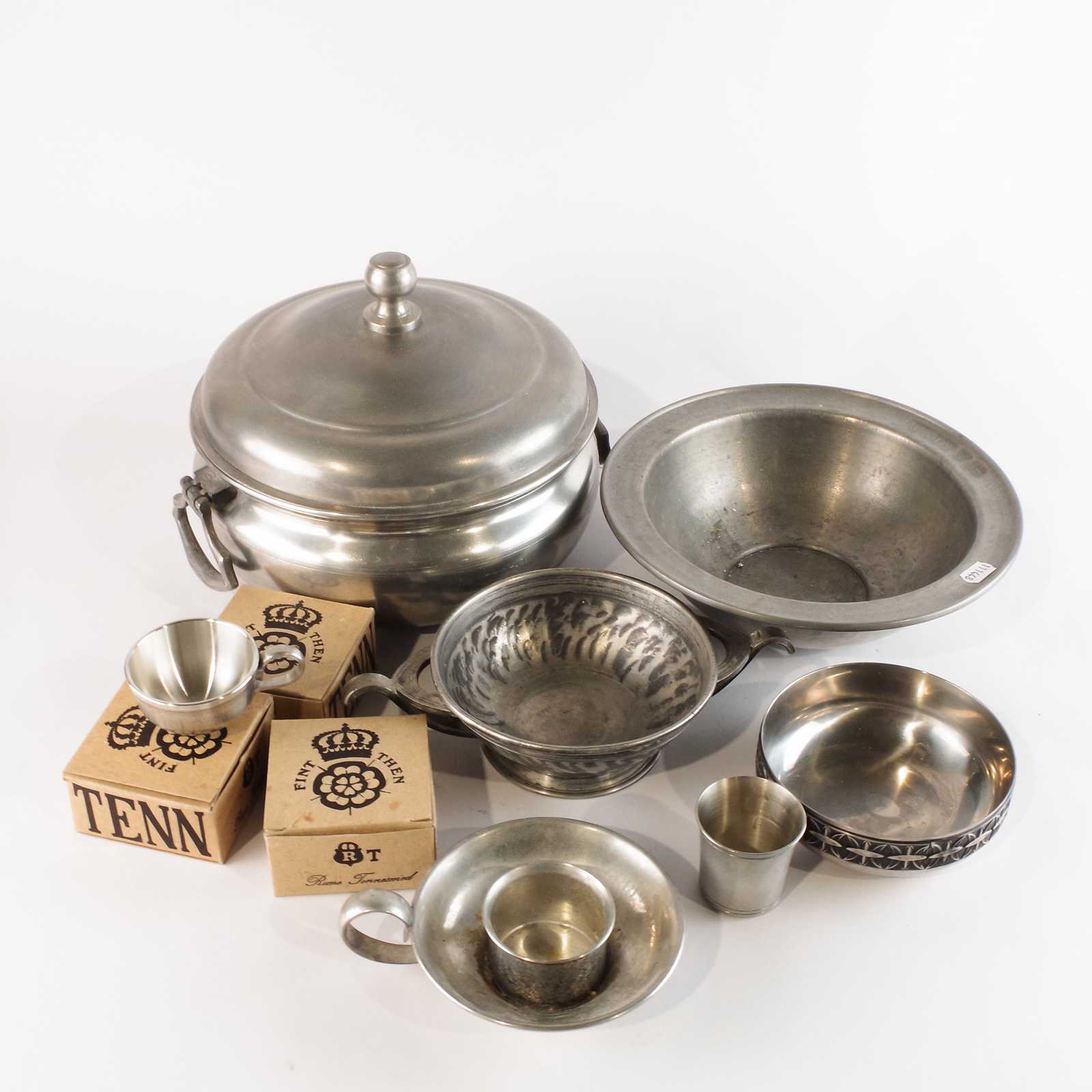 parti TENNFÖREMÅL bla skål, ljusstake och koppar.