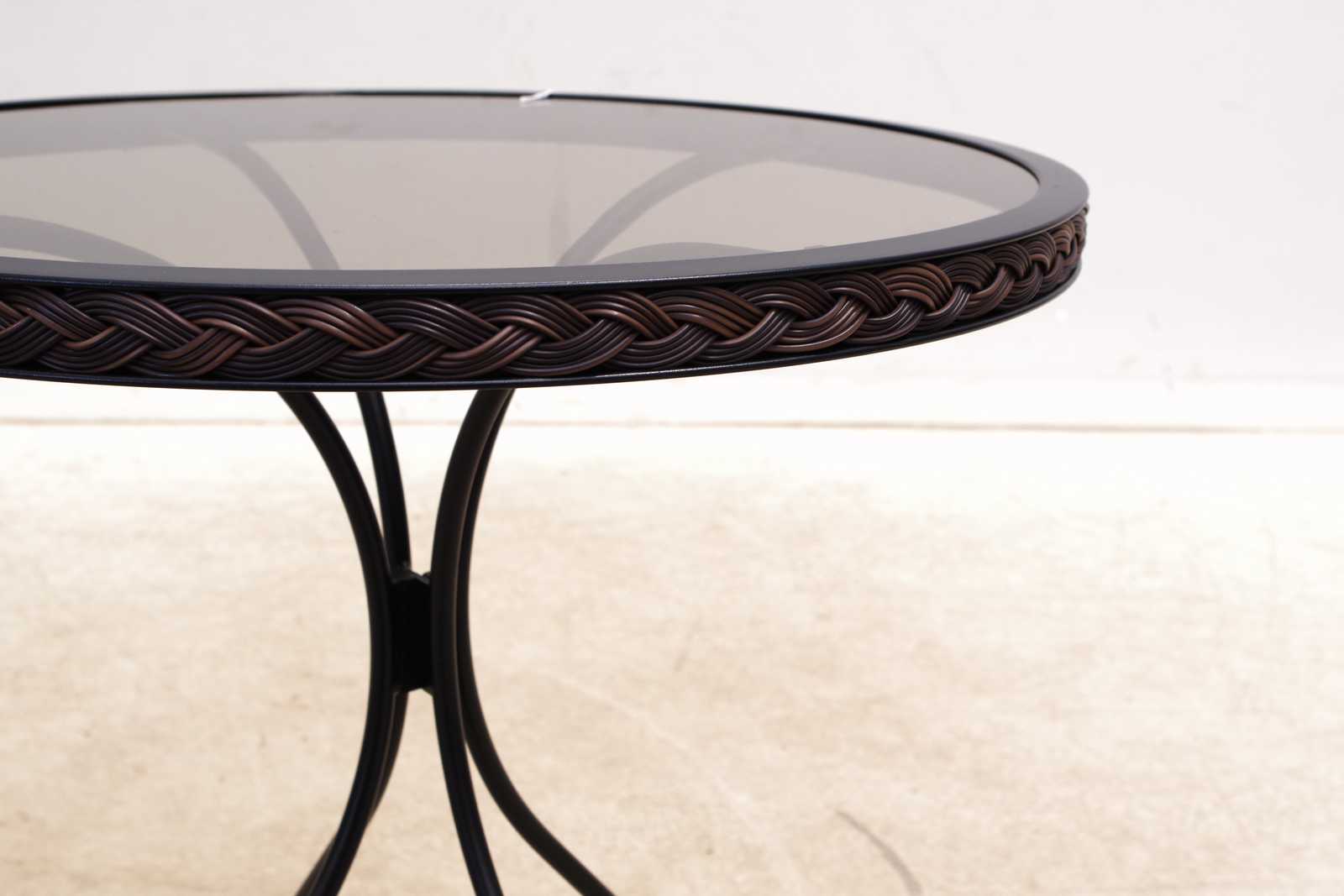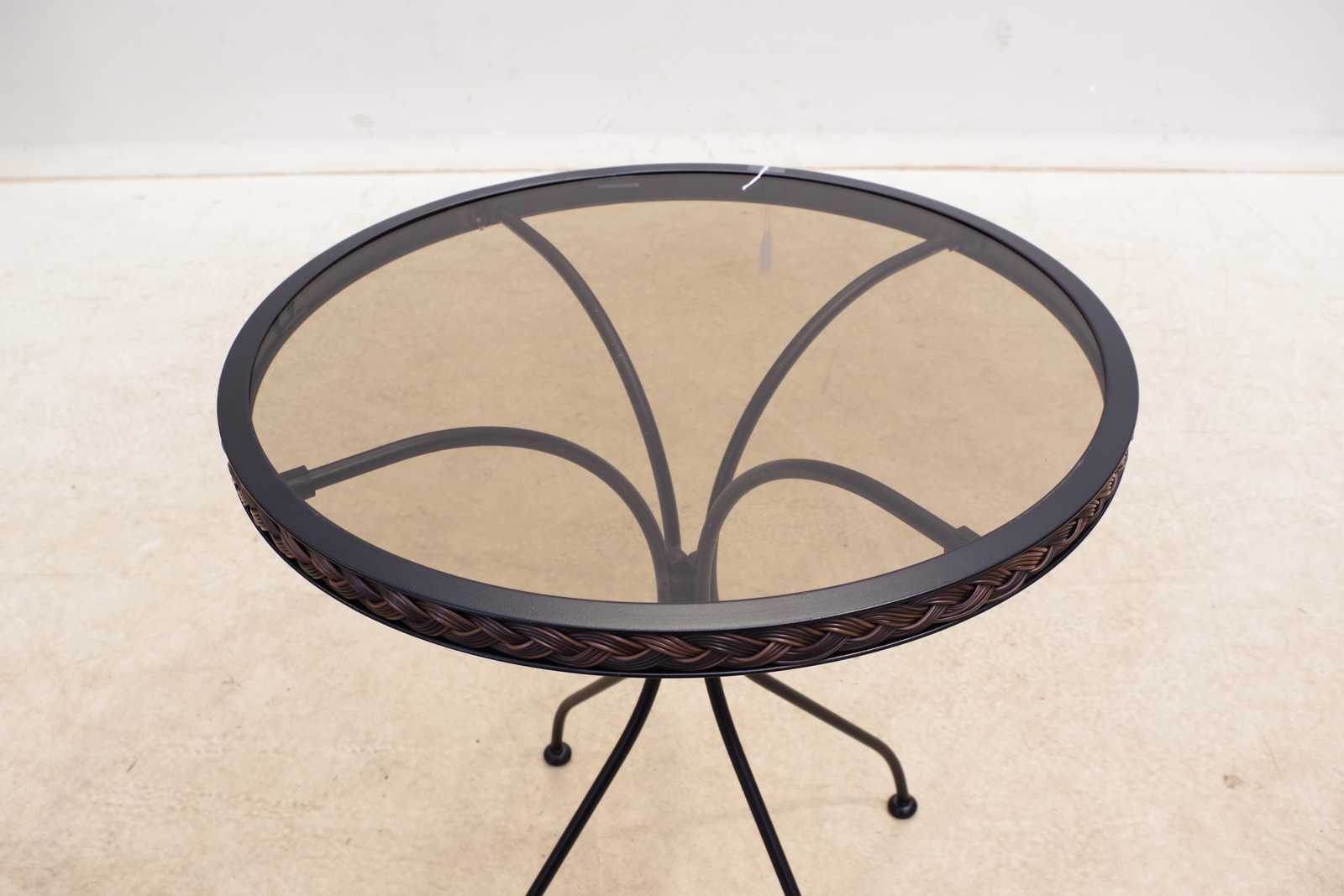 TRÄDGÅRDSBORD med rökfärgad glasskiva, nyskick. H:71cm Dia:64cm Avslutas 2026-03-27 19:19:00