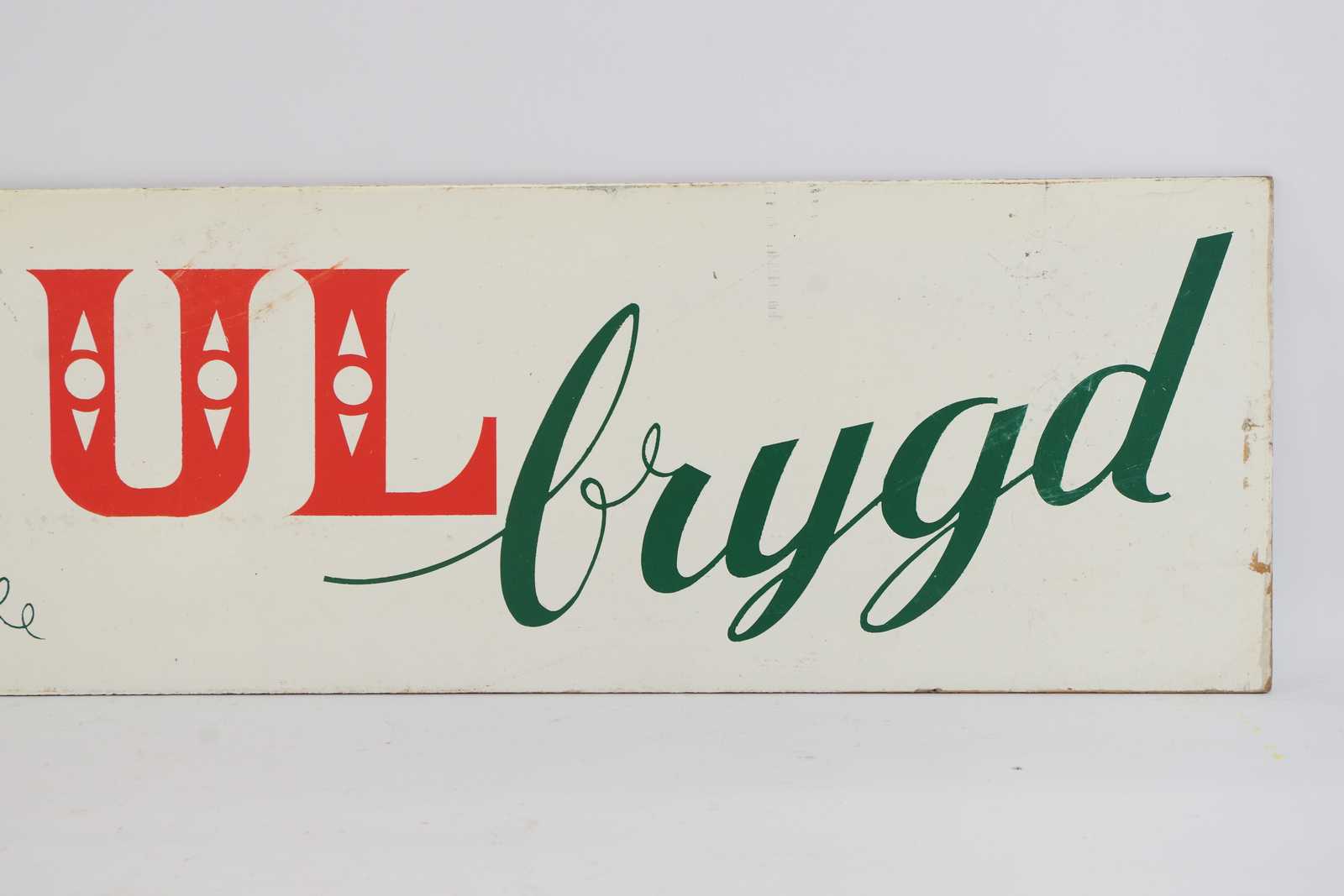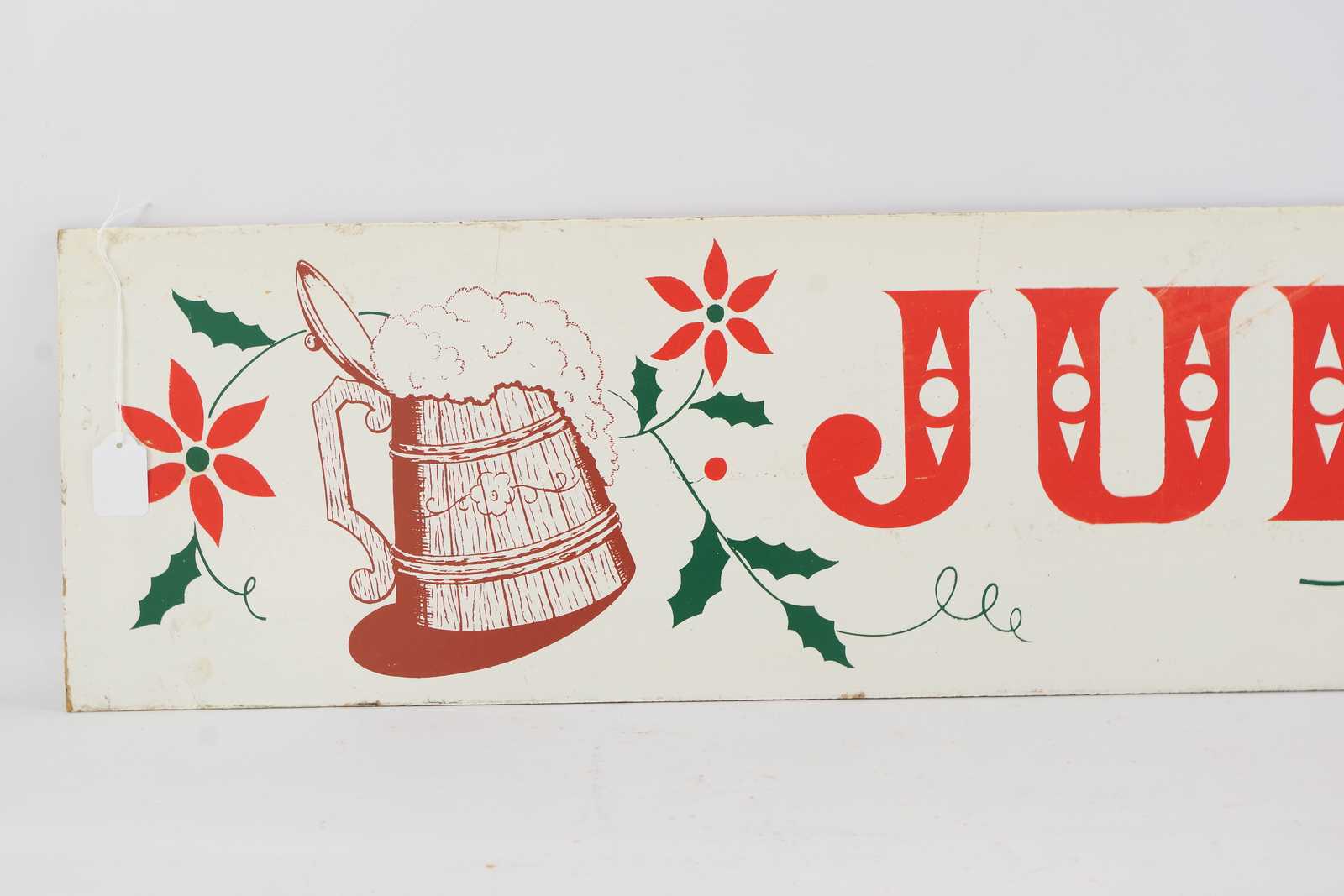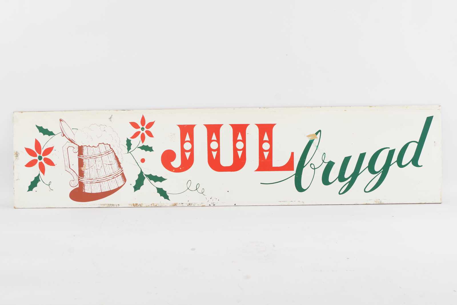 REKLAMSKYLT Julbrygd, tvåsidig från Jösses Bryggeri ,tryckt på masonit. 1900 talets mitt. 110x25cm (slitage, revor förekommer) Avslutas 2025-12-16 19:12:00