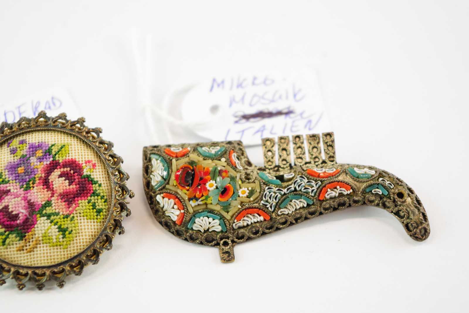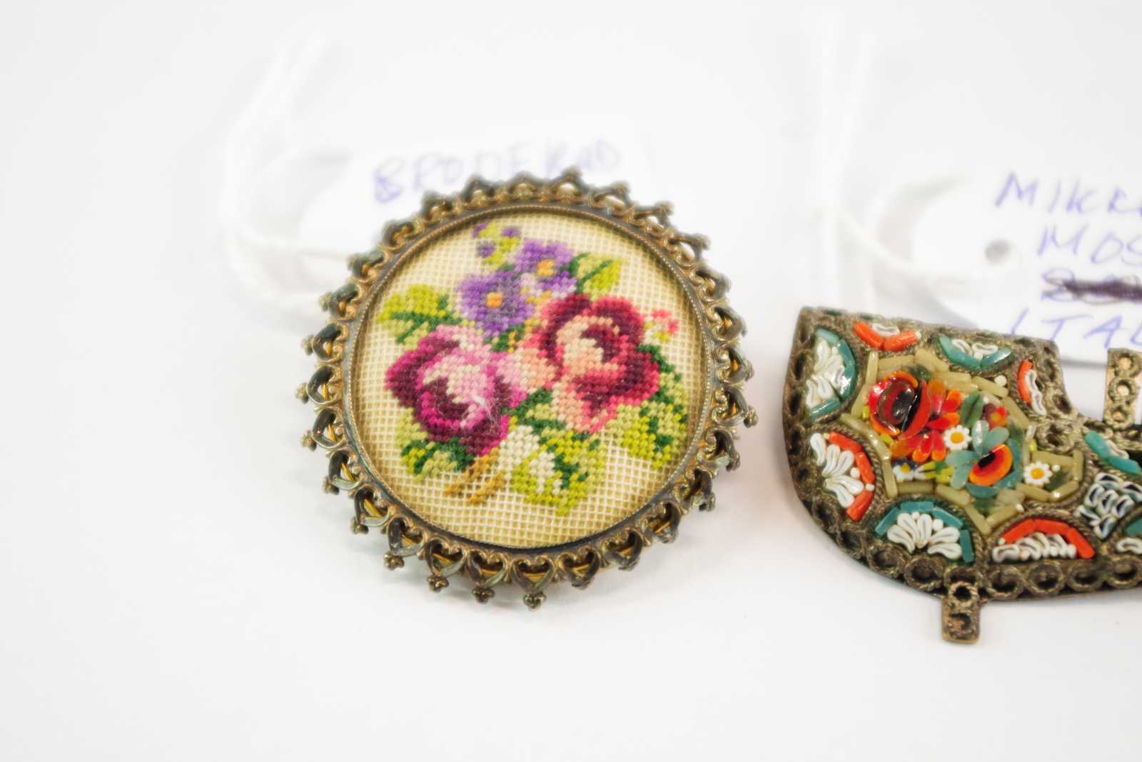 BROSCHER Ena broderad andra med micromosaik Italien Runda D:34 mm