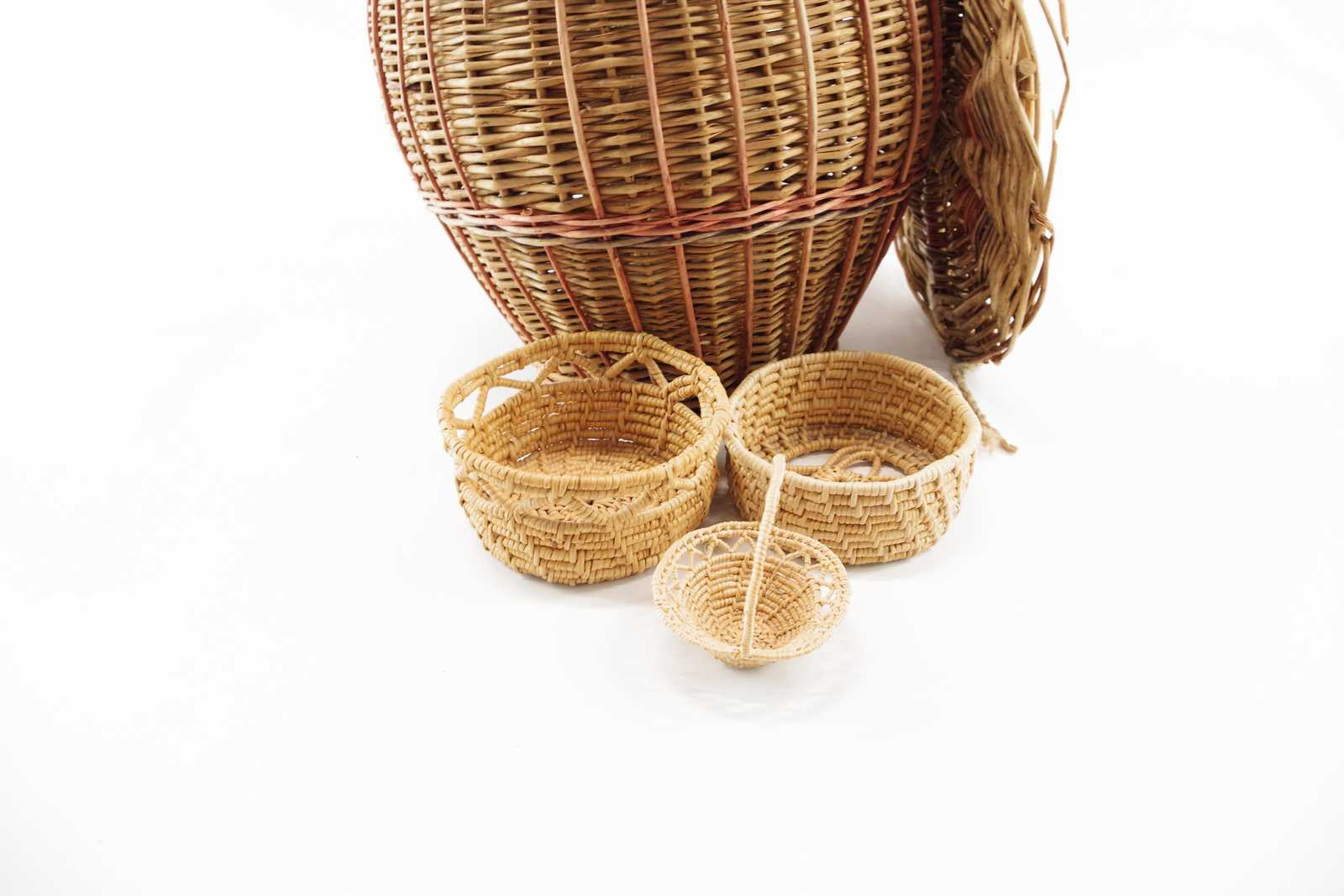 ROTSKÅLAR/FORMAR Största D:9 cm H:4,5 cm, TRÄREDSKAP & KORG med lock (defekter lock)