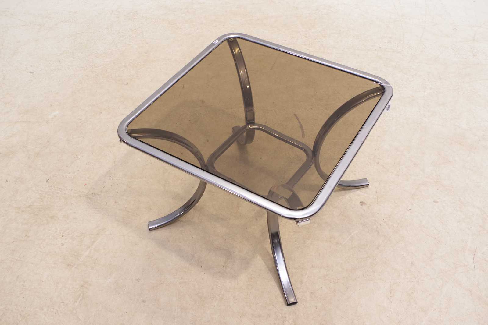 SOFFBORD kromad metall/glasskiva, 1900-talets andra hälft. H:51x 69x 69cm. Bruksslitage