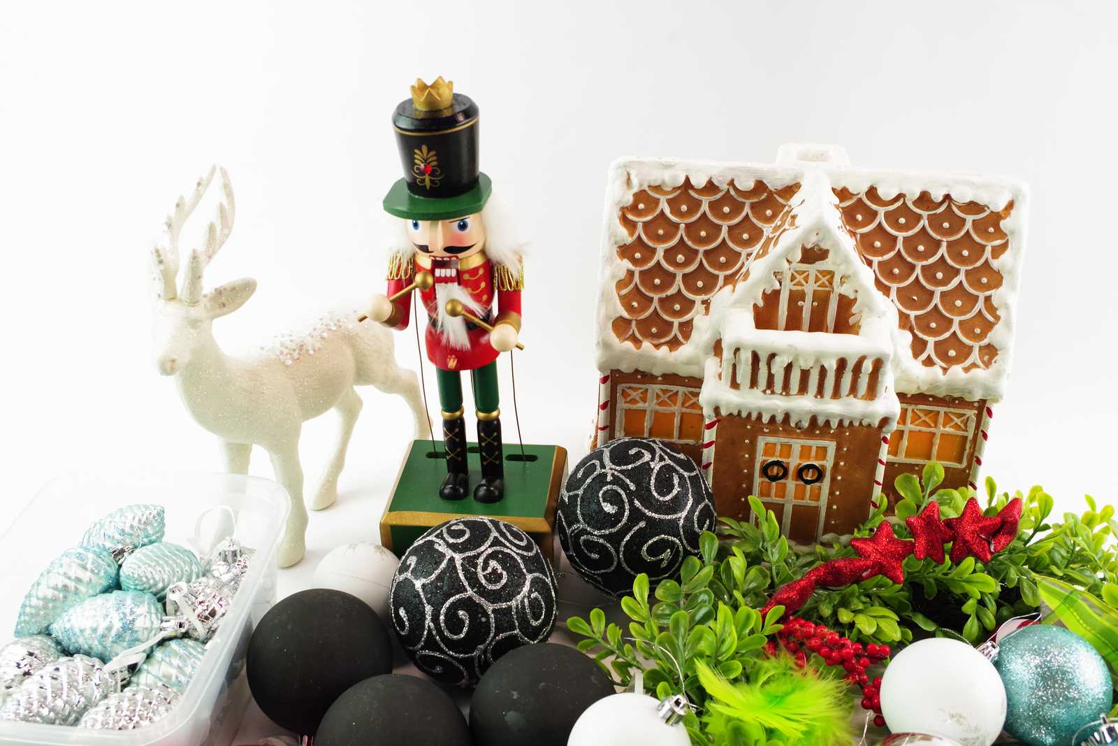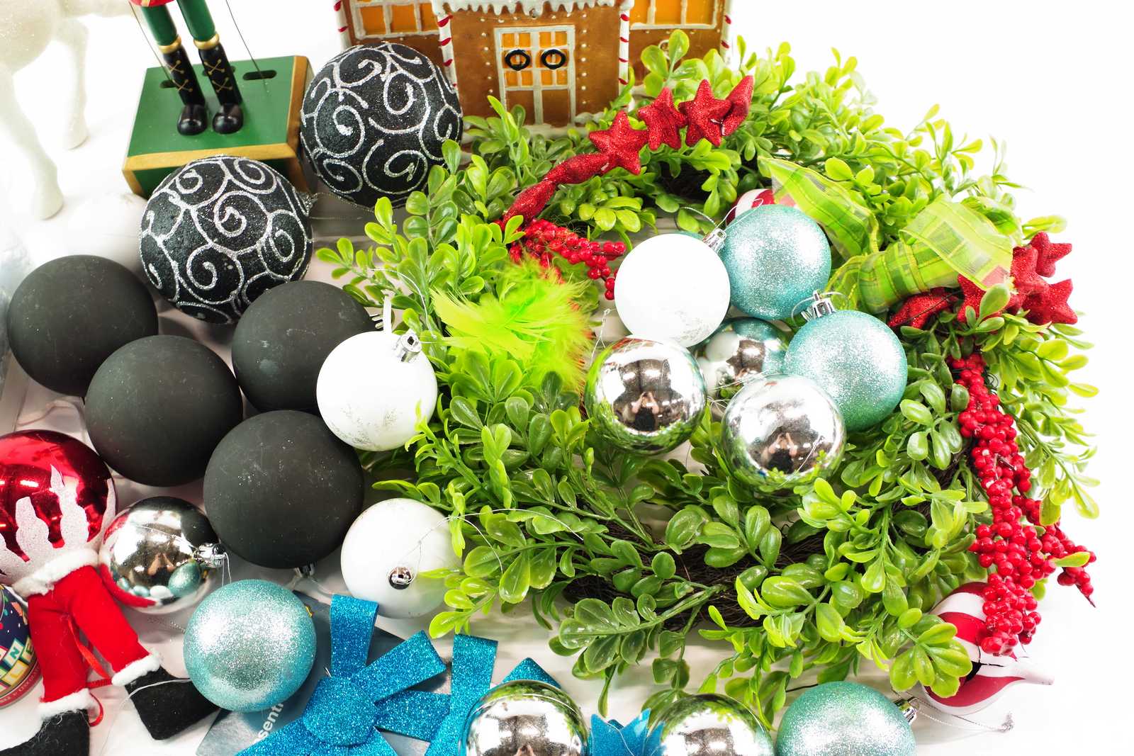 DÖRRKRANS, JULGRANSKULOR, NÖTKNÄPPARE H:30 cm, PEPPARKAKSHUS med belysning, mm