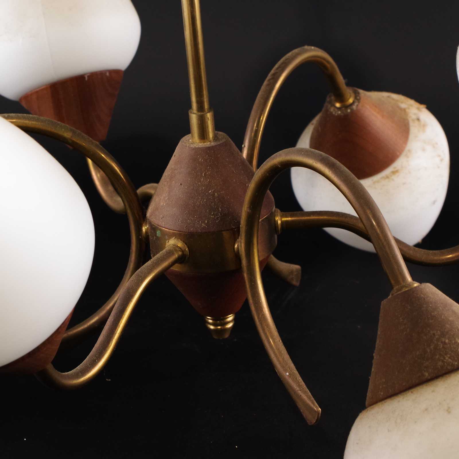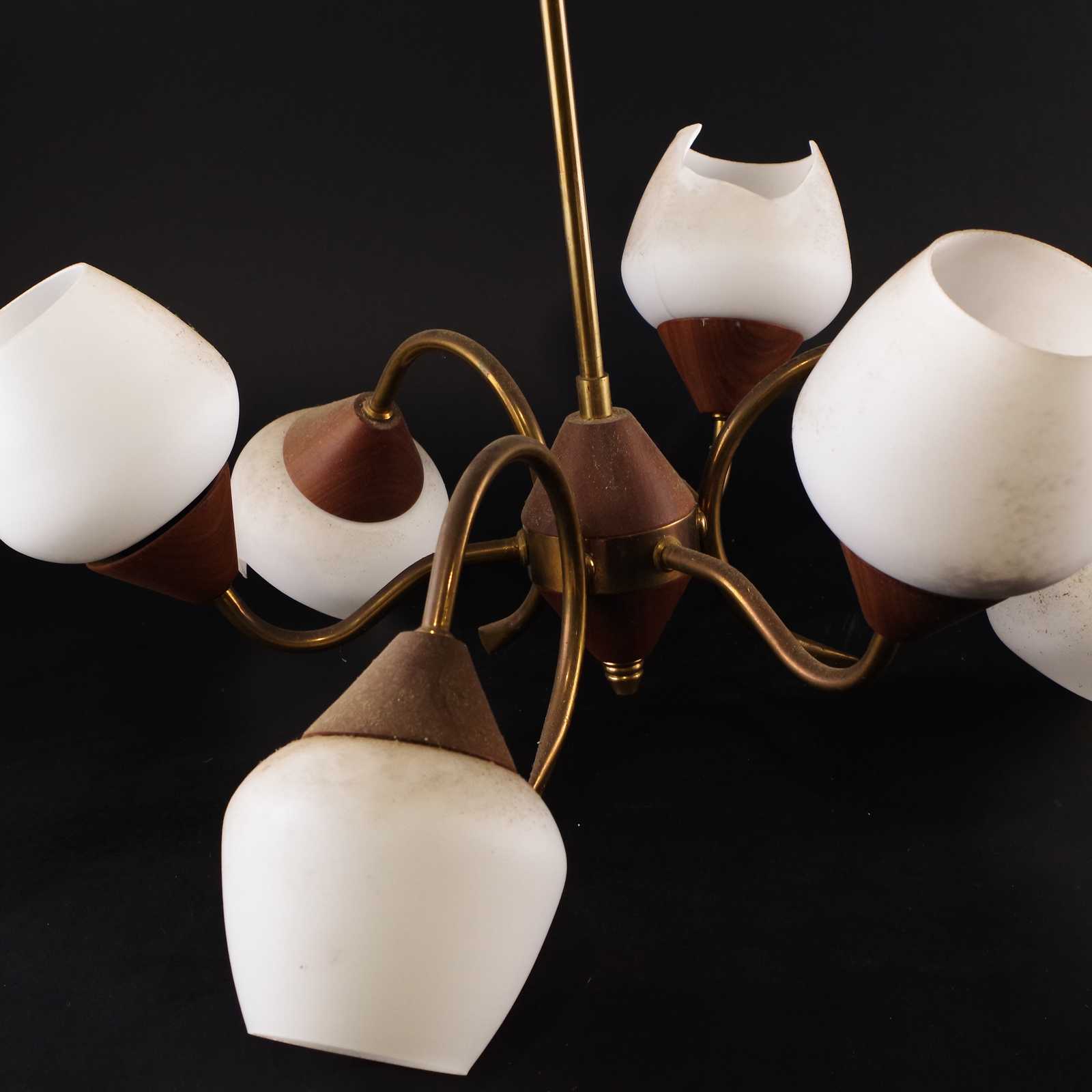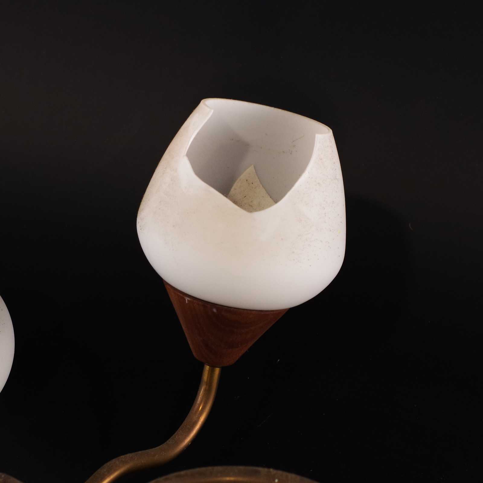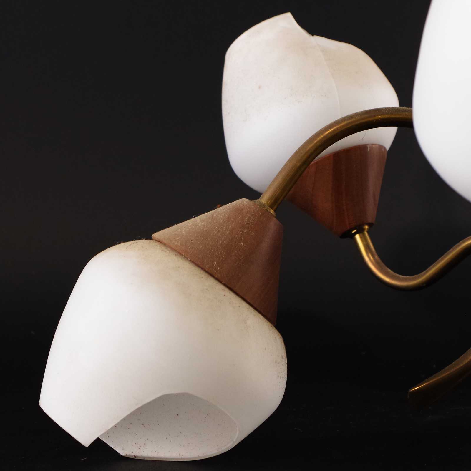 TAKLAMPA, teak/glas/mässing, 1960-tal. D: ca 54cm. OBS två glaskupor är trasiga.