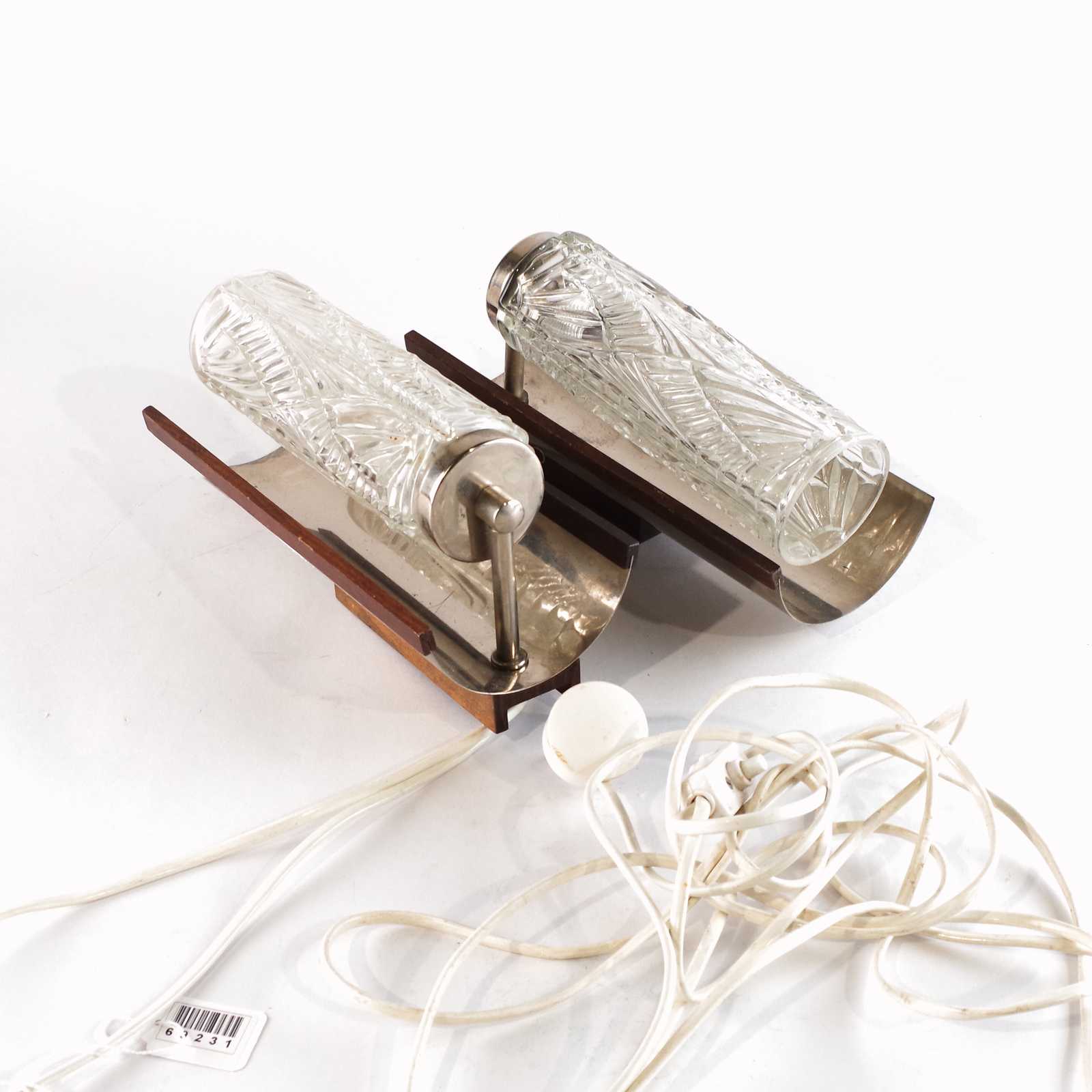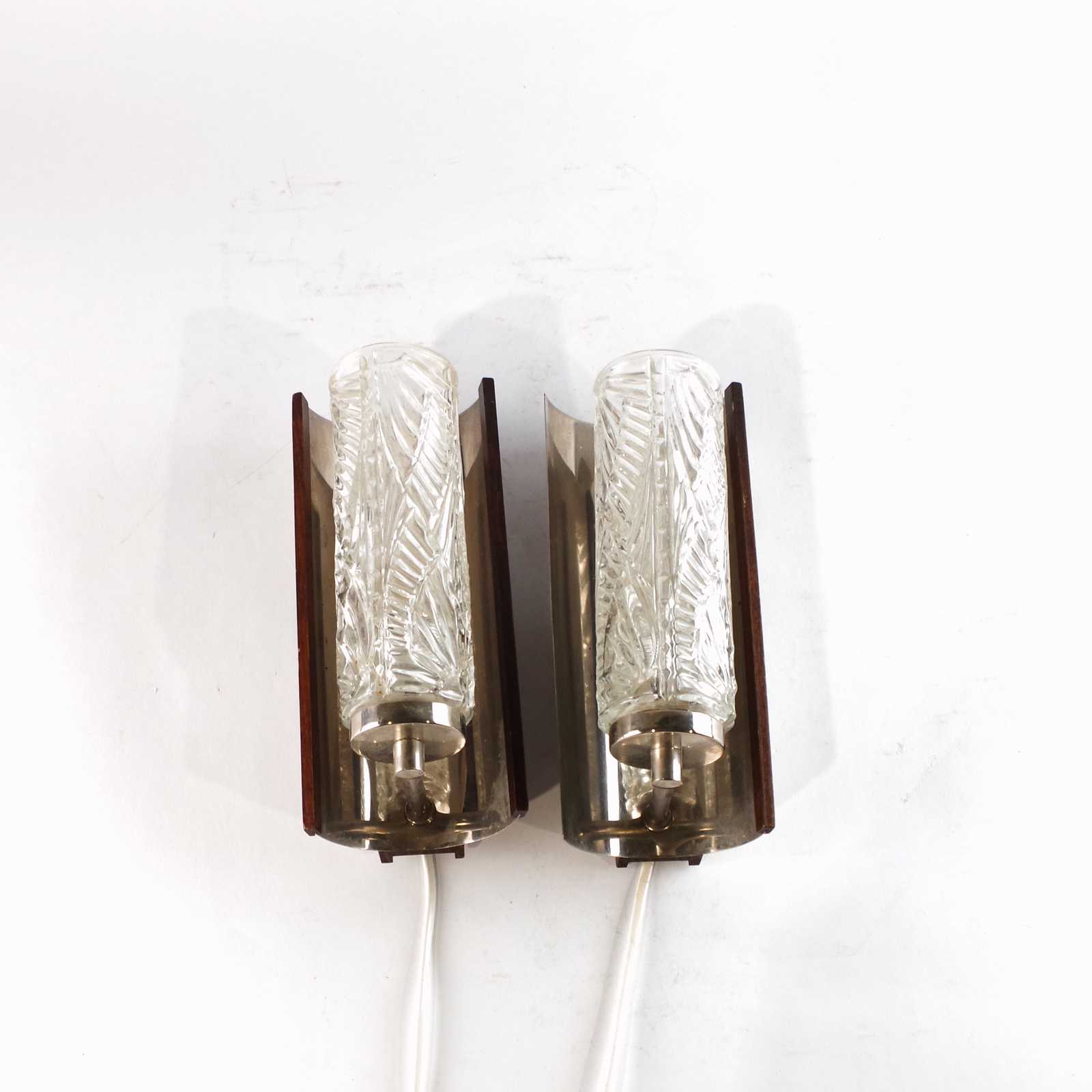 VÄGGLAMPOR, 1 par, 1960-tal, metall/teak/glas. H: ca 24 cm.